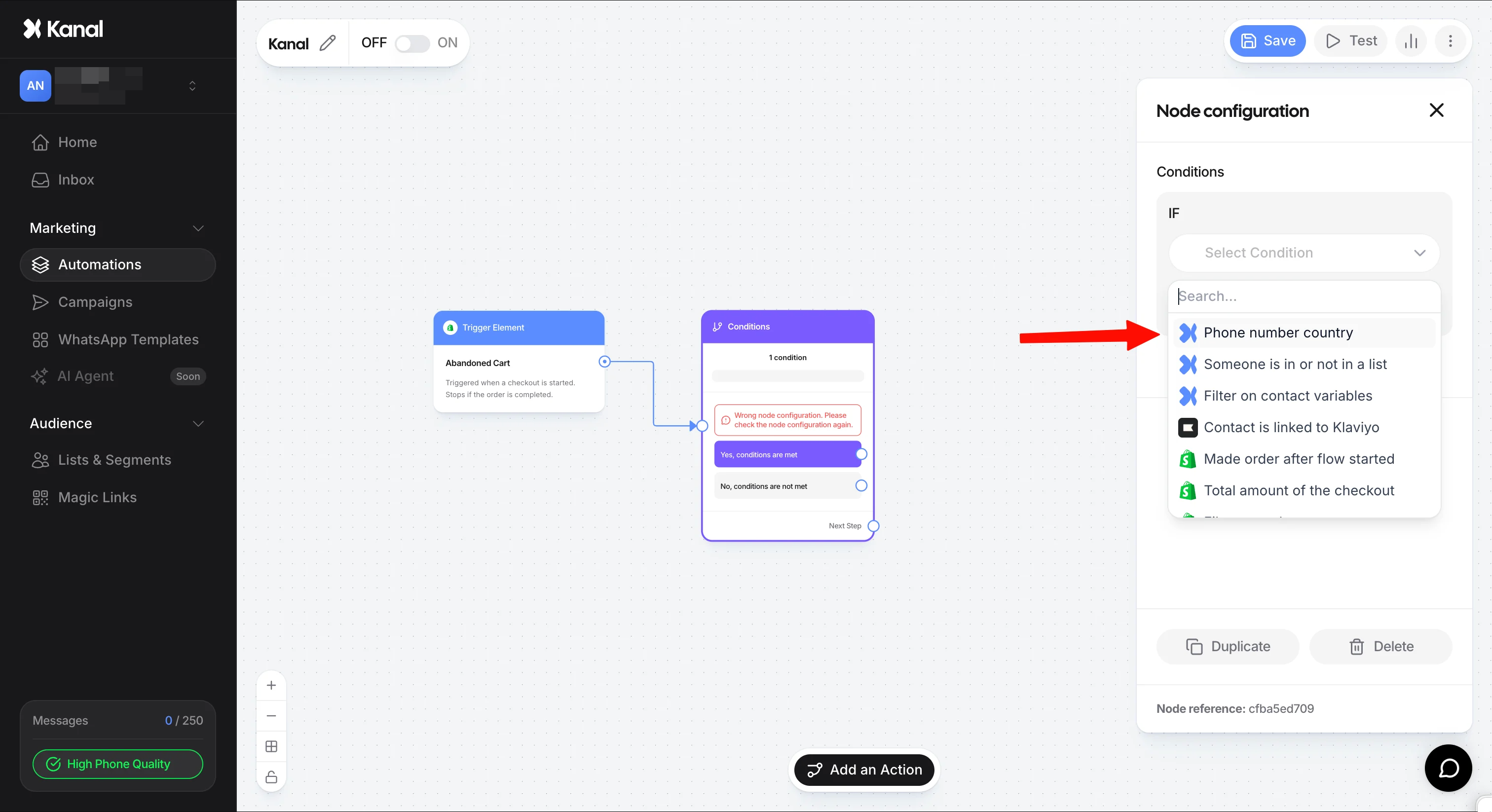 Ajout du nœud de filtrage : Cliquez sur le bouton “Add an Action” et sélectionnez l'option Conditions.