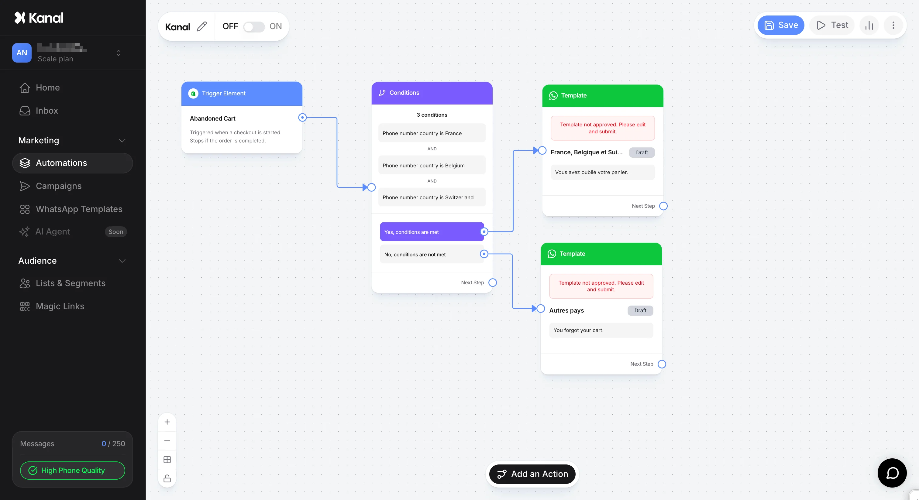 Pour les entreprises opérant sur plusieurs marchés, la personnalisation de la langue est un facteur déterminant pour le taux de conversion. Kanal permet de segmenter vos flux automatiques afin d'envoyer le bon template de message en fonction de l'origine de votre client ou de ses préférences linguistiques.