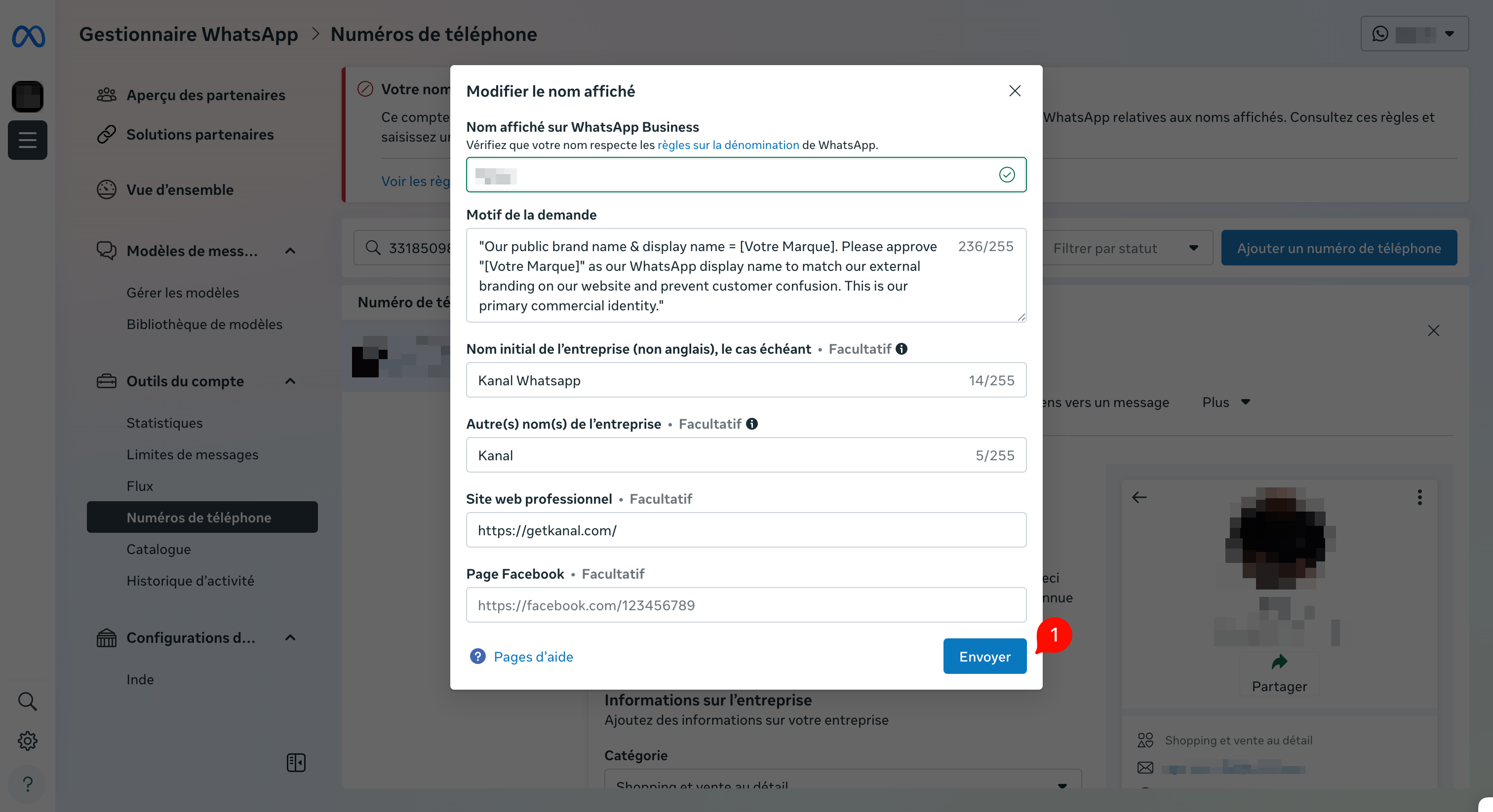 "Our public brand name & display name = [Votre Marque]. Please approve "[Votre Marque]" as our WhatsApp display name to match our external branding on our website and prevent customer confusion. This is our primary commercial identity."