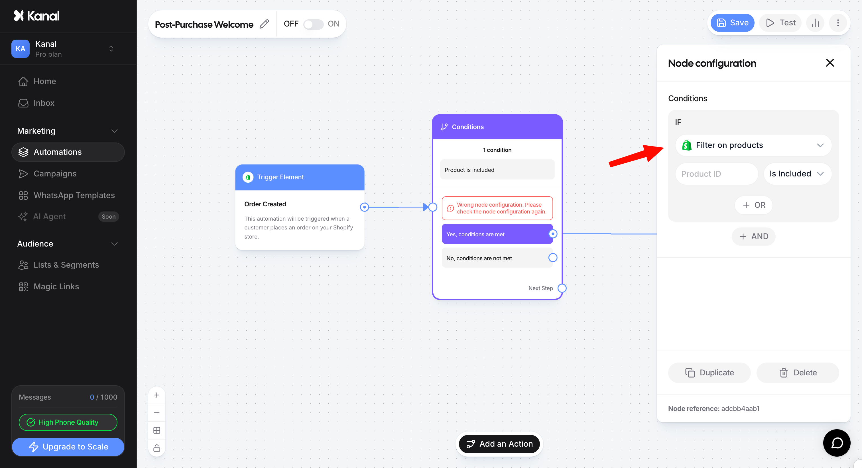 Juste après votre élément déclencheur (par exemple Post-purchase), ajoutez un nœud Conditions.