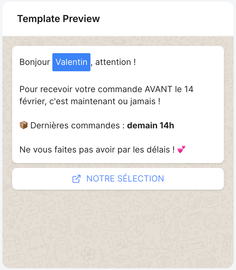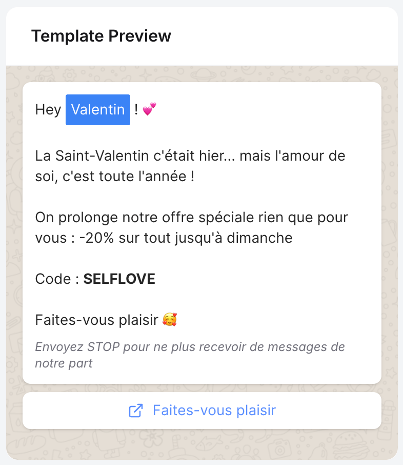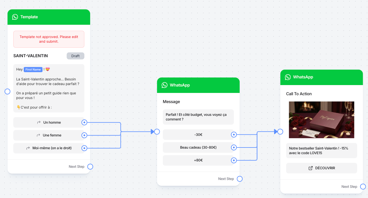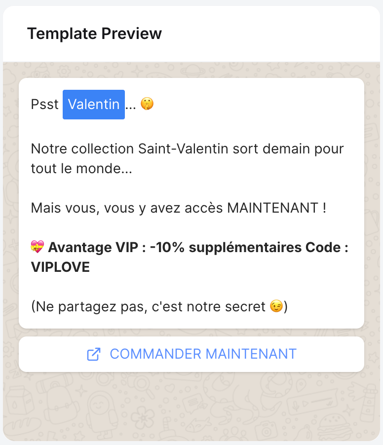 Le concept : Offrez à vos abonnés WhatsApp (via les segments) un accÚs anticipé à votre collection ou offre Saint-Valentin.