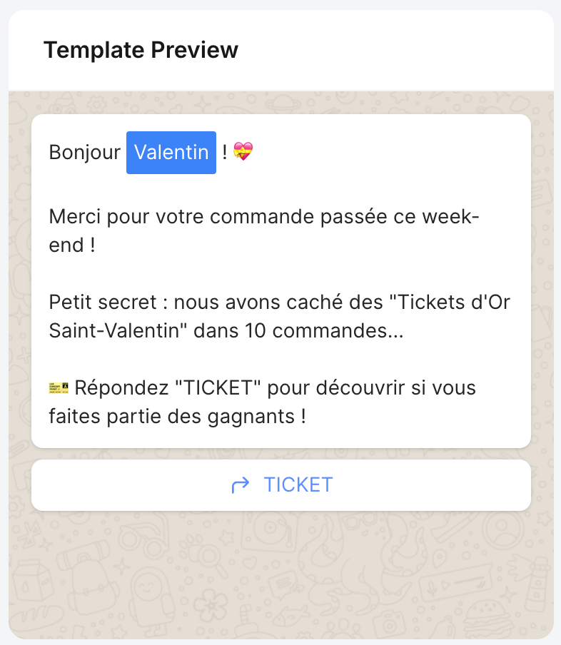 Le concept : Glissez virtuellement un ticket gagnant dans certaines commandes passées pendant la période. Les clients découvrent s'ils ont gagné via WhatsApp. L'idée c'est de récompenser a posteriori des clients qui ont déjà commandé, pas de leur faire croire qu'il y a un truc physique dans leur colis.