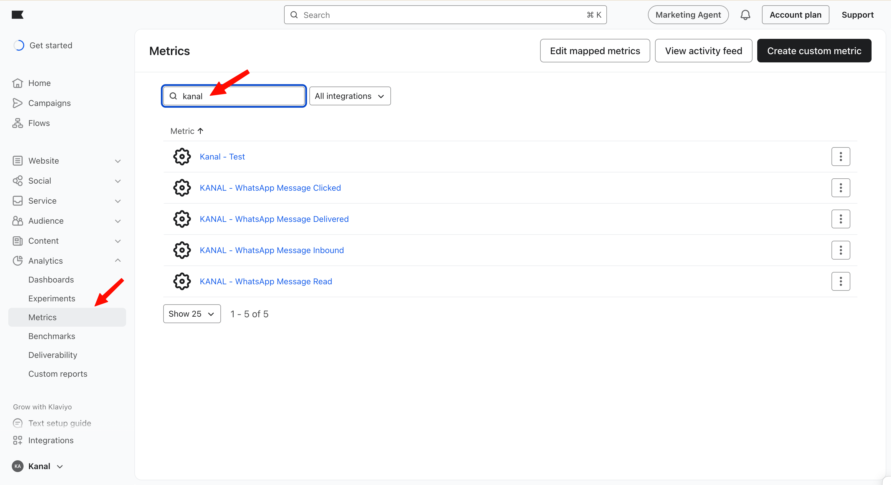 Si vous pouvez utiliser Klaviyo pour déclencher des envois WhatsApp, Kanal renvoie en temps réel des informations précieuses sur l'engagement de vos clients. Ces données, appelées "Metrics", vous permettent de mesurer l'efficacité de vos messages et de créer des segments d'une précision chirurgicale.