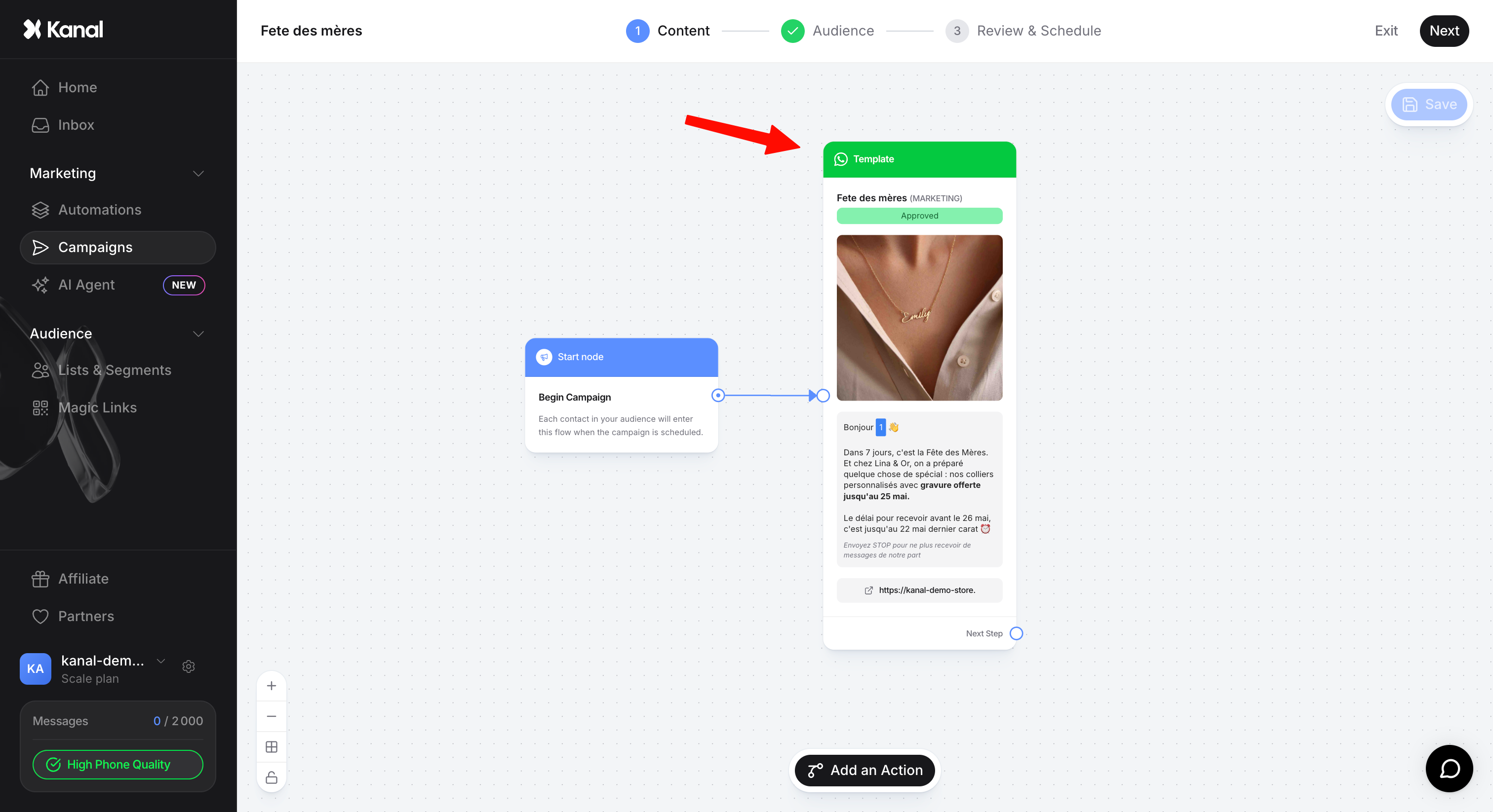 Personnalisation avancée : Comme dans vos automatisations, vous pouvez désormais connecter d'autres nœuds à la suite de votre message (délais, conditions, ou même des actions comme l'ajout d'un tag) pour créer des campagnes interactives complexes.